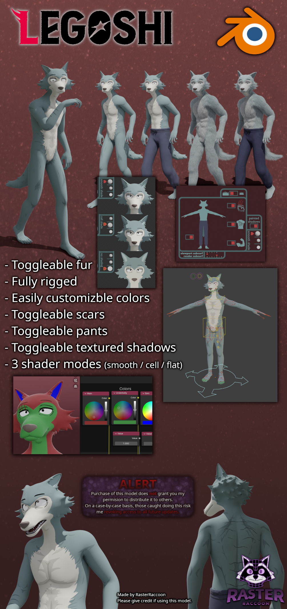 IT IS EXTREMELY DIFFICULT OR IMPOSSIBLE TO PORT THIS MODEL TO VR CHAT, SFM, ETC DUE TO HOW THE RIG AND FUR WORK.